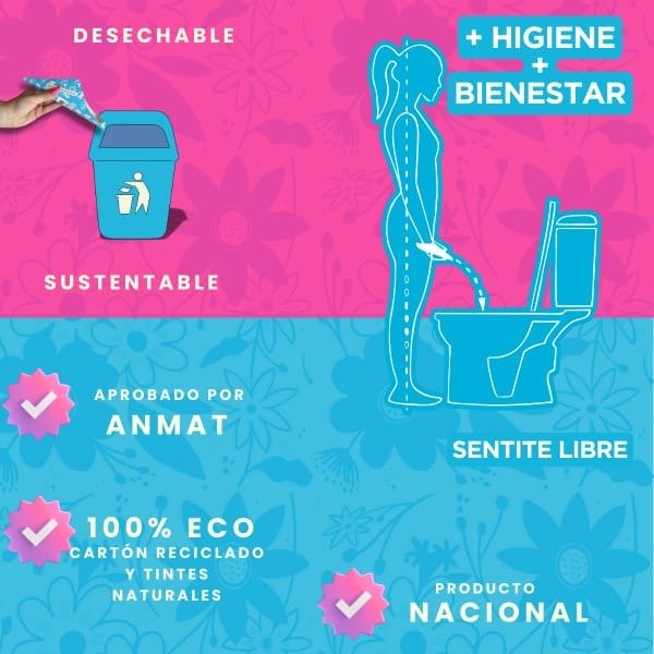 Dispositivo Pocket y Descartable para orinar de pie, ideal para mujeres de todas las edades. Ergonómico. Util en los post-operatorios, para las embarazadas, las convalencientes. Para evitar todo tipo de contacto con los inodoros, evitando contagios, ensuciarte o retener el deseo de micción por falta de ellos. Podés usarlo en baños tanto como al aire libre. La boquilla de salida se adapta para utilizar en el pico de una botella si no pudieras usarlo al aire libre. Ideal para las niñas que deben ir solas al baño y por su altura rozan el asiento del inodoro. Excelente para las mujeres que ya no pueden hacer de cuclillas.