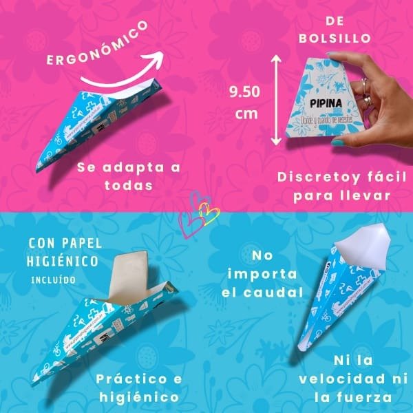 Dispositivo Pocket y Descartable para orinar de pie, ideal para mujeres de todas las edades. Ergonómico. Util en los post-operatorios, para las embarazadas, las convalencientes. Para evitar todo tipo de contacto con los inodoros, evitando contagios, ensuciarte o retener el deseo de micción por falta de ellos. Podés usarlo en baños tanto como al aire libre. La boquilla de salida se adapta para utilizar en el pico de una botella si no pudieras usarlo al aire libre. Ideal para las niñas que deben ir solas al baño y por su altura rozan el asiento del inodoro. Excelente para las mujeres que ya no pueden hacer de cuclilla